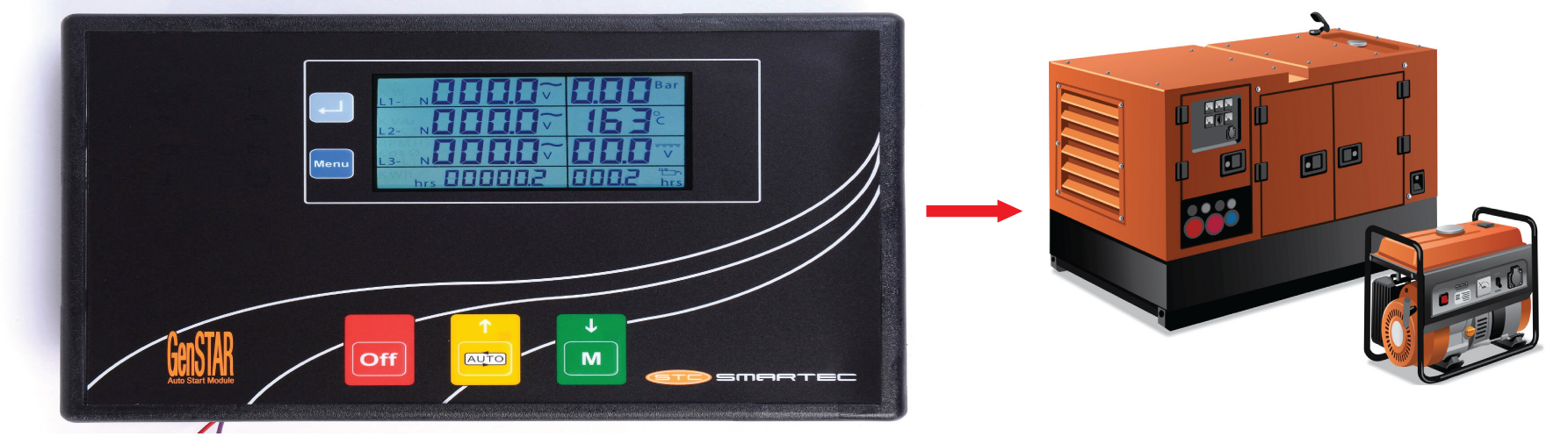 The GENSTAR is an auto start generator controller that can control one generator. It includes a large LCD display, 5 control push buttons, 10 indicator LEDs. It displays all information needed to analyze the system. It monitors internal protections and external fault inputs. It can display all current and voltage measurements for the main power.