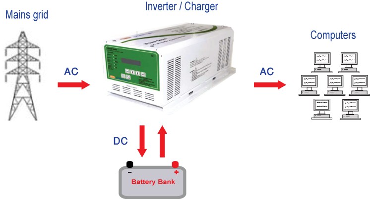 In this configuration the grid supplies the computer park directly through the inverter/charger's "bypass" function. In case of a power drop or a cutoff from the grid, the inverter/charger secures the supply to the users.